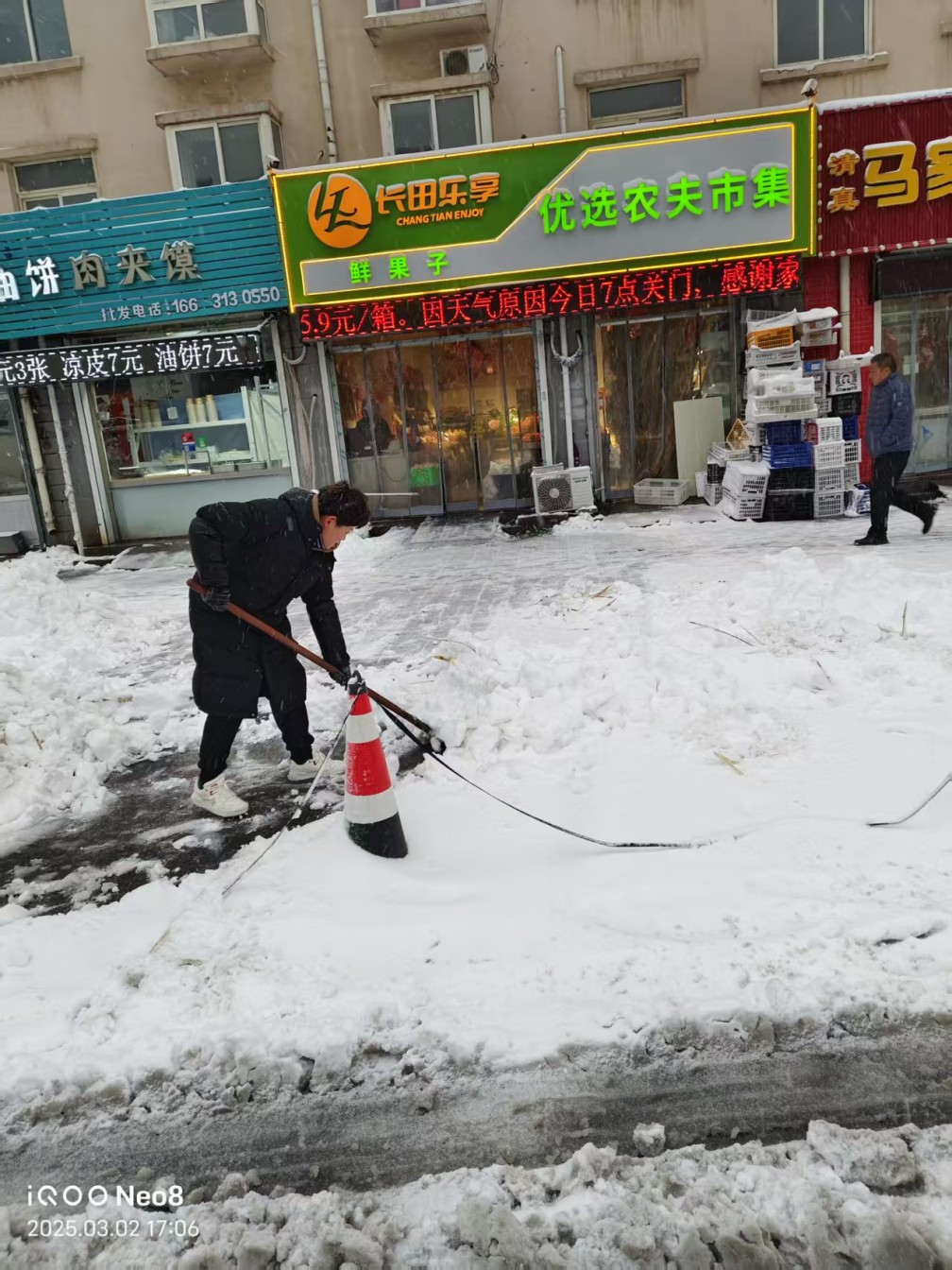 飛雪增寒意,清雪暖人心。3月2日,一場突如其來的春雪為大地披上了素白銀裝。鵝毛般的雪花紛紛揚揚下了一整天,道路上的積雪深達十余厘米,道路濕滑,臺階結(jié)冰,給出行埋下了安全隱患。面對極端天氣考驗,長田實業(yè)各業(yè)態(tài)以“雪”為令,迅速響應(yīng),投入到這場與冰雪的“戰(zhàn)斗”中。大家不畏嚴寒,齊心協(xié)力用實際行動展現(xiàn)長田人的強大凝聚力和高效行動力。