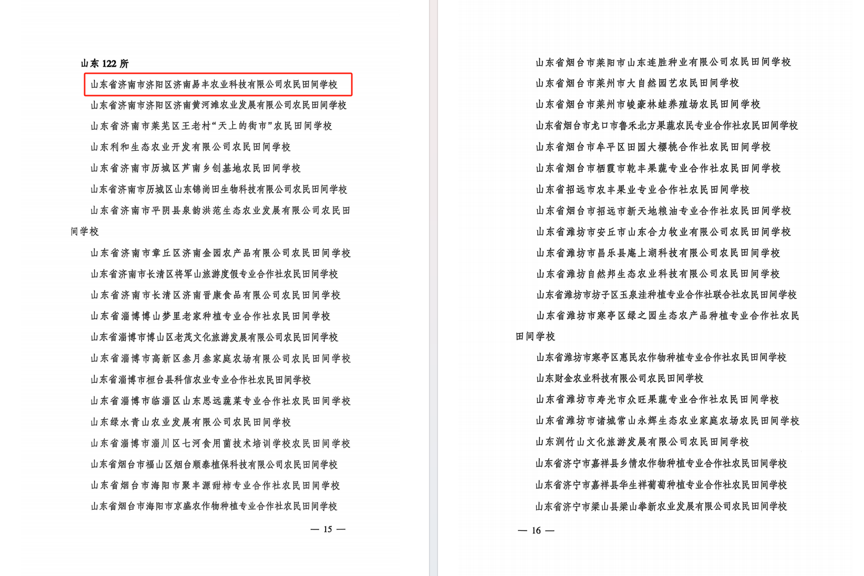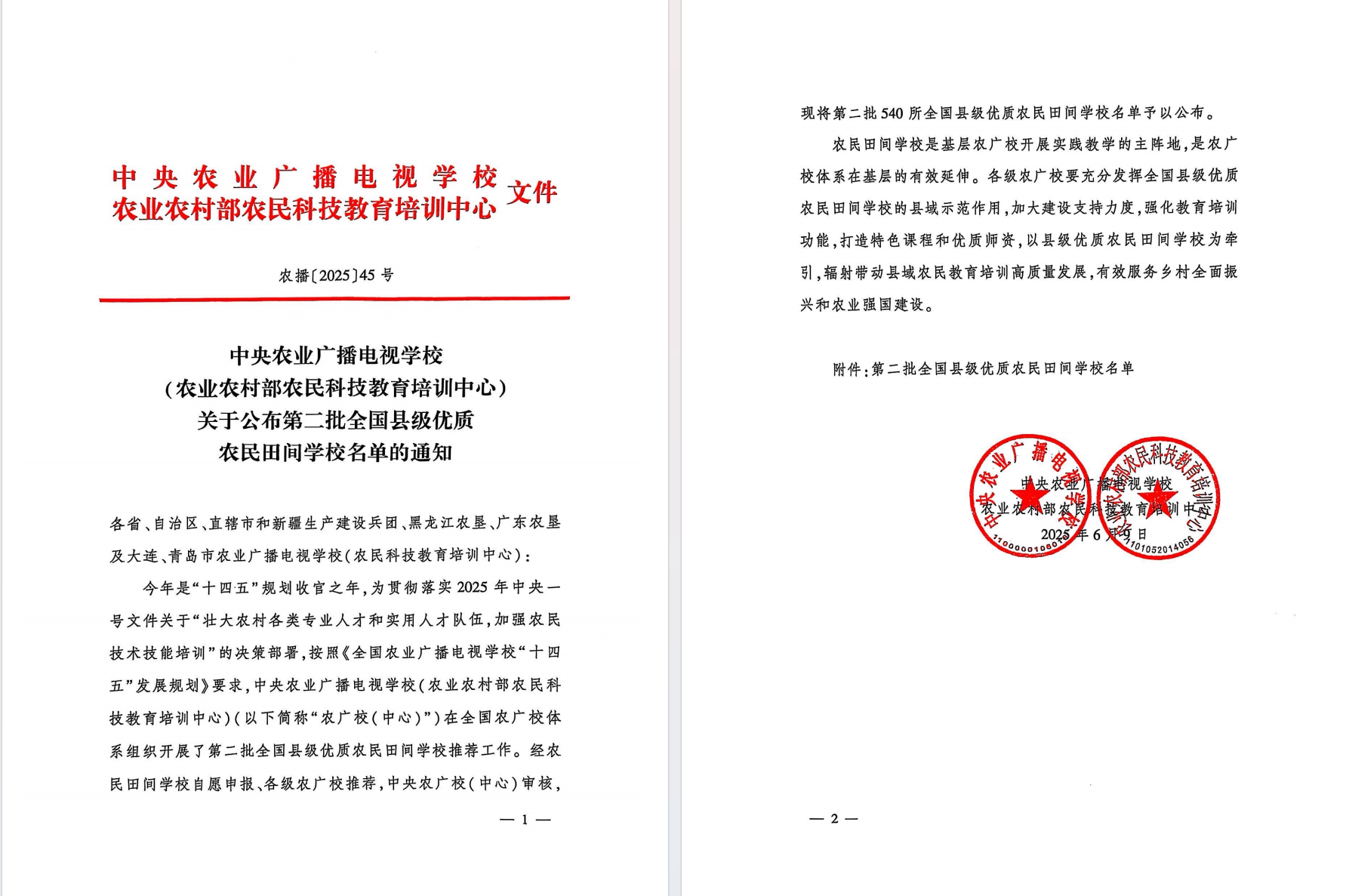 2025年6月9日,中央農(nóng)業(yè)廣播電視學(xué)校(農(nóng)業(yè)農(nóng)村部農(nóng)民科技教育培訓(xùn)中心)公布了“第二批全國縣級優(yōu)質(zhì)農(nóng)民田間學(xué)校名單”。濟南易豐農(nóng)業(yè)科技有限公司農(nóng)民田間學(xué)校,榮耀上榜,榮獲國家級殊榮!