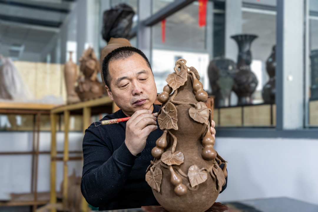 然而,隨著市場(chǎng)變遷與傳統(tǒng)工藝的式微,2010年后,濟(jì)陽黑陶企業(yè)陸續(xù)關(guān)停,到2018年,僅剩一家作坊在勉強(qiáng)維持。轉(zhuǎn)機(jī)出現(xiàn)在2019年,長(zhǎng)田實(shí)業(yè)董事長(zhǎng)張勇了解到黑陶的困境,毅然注資成立濟(jì)南龍格黑陶藝術(shù)研究院。“這不是簡(jiǎn)單的商業(yè)投資,而是對(duì)文化根脈的守護(hù)?!?/span>他的話堅(jiān)定而有力。研究院成立六年來,不僅系統(tǒng)整理了龍山黑陶的傳統(tǒng)工藝,更聯(lián)合高校開展課題研究,讓古老技藝與現(xiàn)代科技碰撞出新火花。