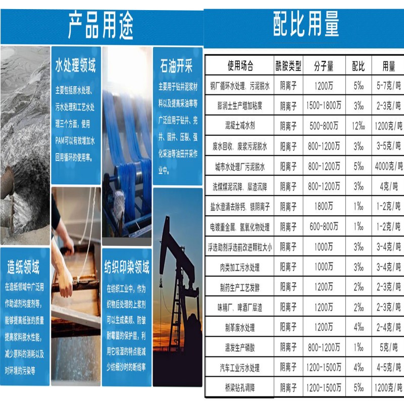 油田三次采油去油劑陰離子PAM:可以調節(jié)注入水的流變性,增加驅動液的粘度,改善水驅波急效率,降低地層中水相滲透率,使水和油能均速地向前流動。在石油開采方面只要用于油田的三次采油,每注入一噸高分子聚丙烯酰胺產品,可多采原油150噸作用。